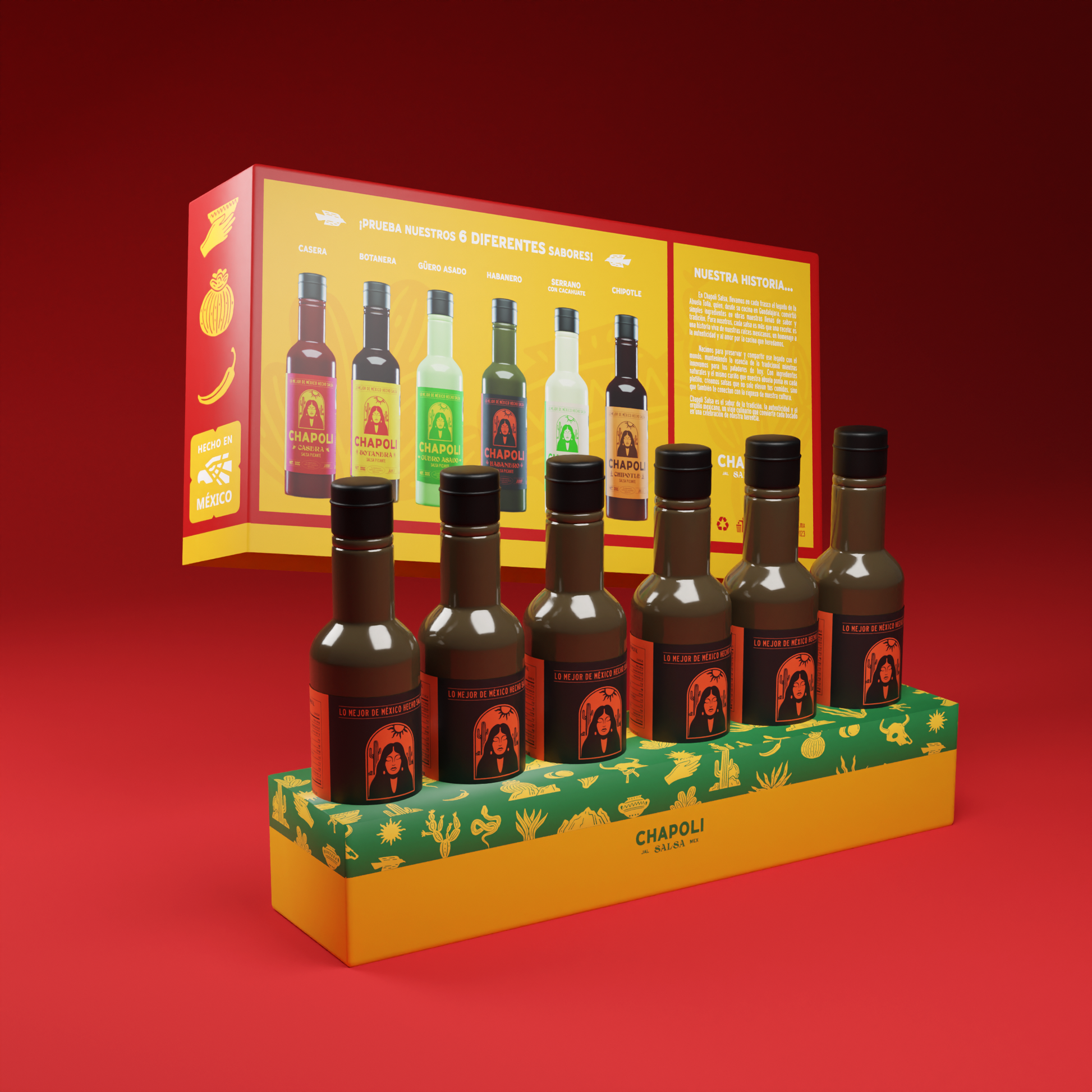 La Caja Mix contiene nuestros seis sabores: Casera, Habanero, Serrano con Cacahuate, Botanera, Chipotle y Güero Asado.